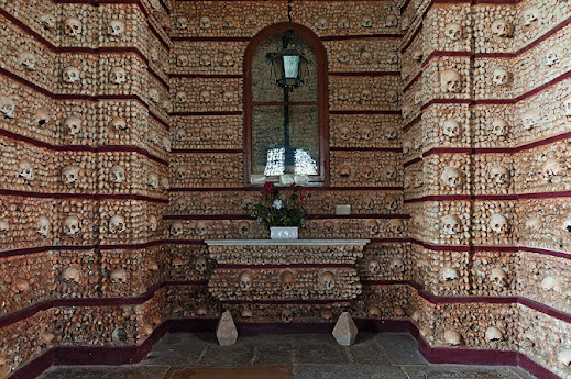 Seguindo o princípio católico de cultuar a morte, como forma de lembrar aos seus devotos a brevidade da vida, em contraste com a vida eterna, prometida pelo catolicismo, algumas igrejas católicas, adornam suas paredes com milhares de ossos humanos em arranjos macabros, compostos por crânios, fêmures, tíbias, etc. Ossos retirados de cemitérios das próprias igrejas. Ao entrar em tais ambientes, o devoto tem a macabra impressão de estar sendo observado pelos milhares de crânios.